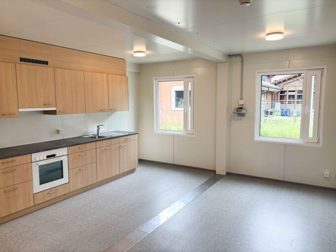 Neben den Zellen umfasst die temporäre Einrichtung auch einen Aufenthaltsraum mit Küche (25.7 m²), einen Duschraum, einen Garderoben- und Technikbereich sowie weitere Räume für Therapie und Sozialdienste. Alle Räume sind beheizt und klimatisiert und bieten damit einen ganzjährigen Nutzungskomfort.